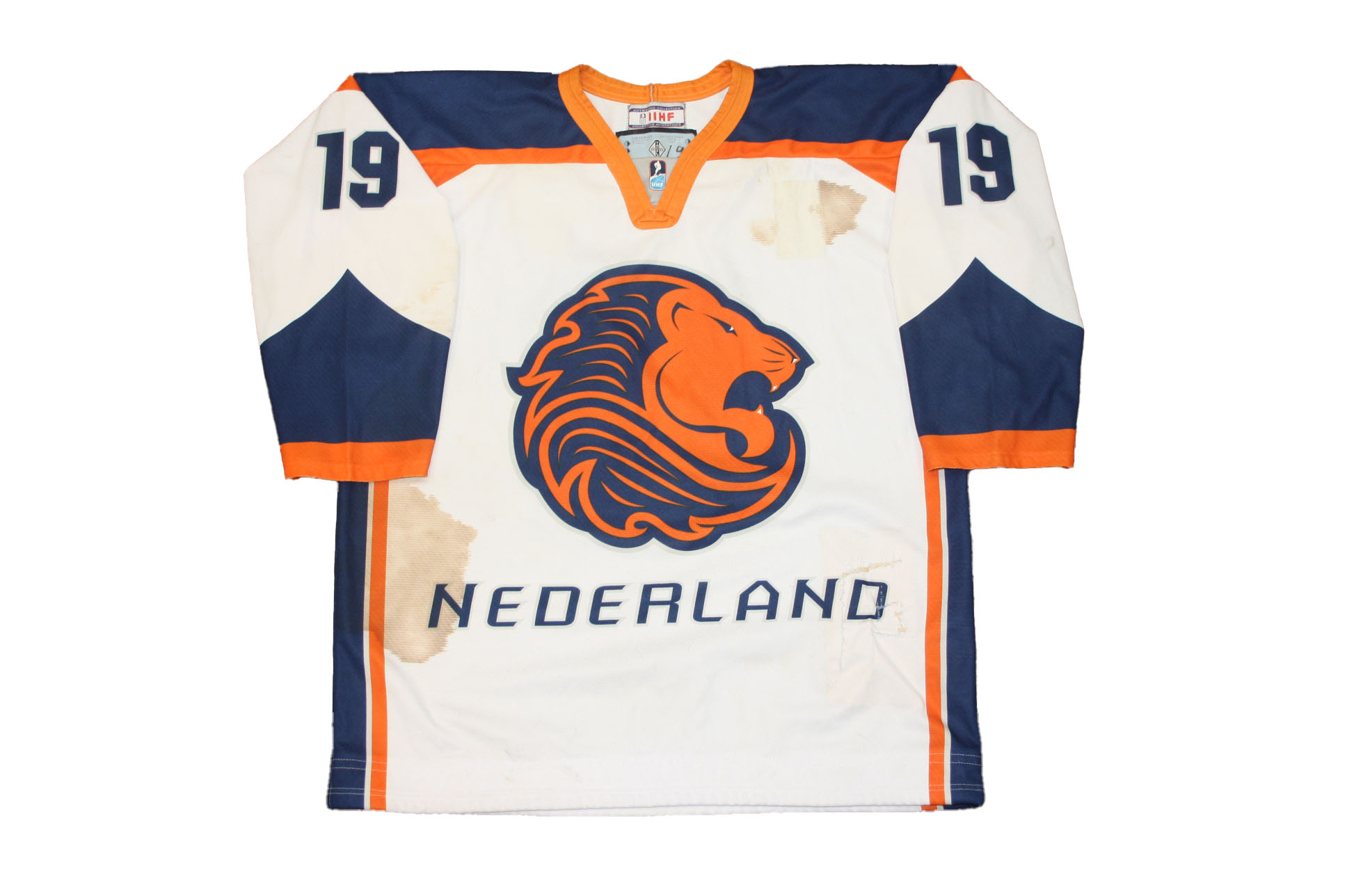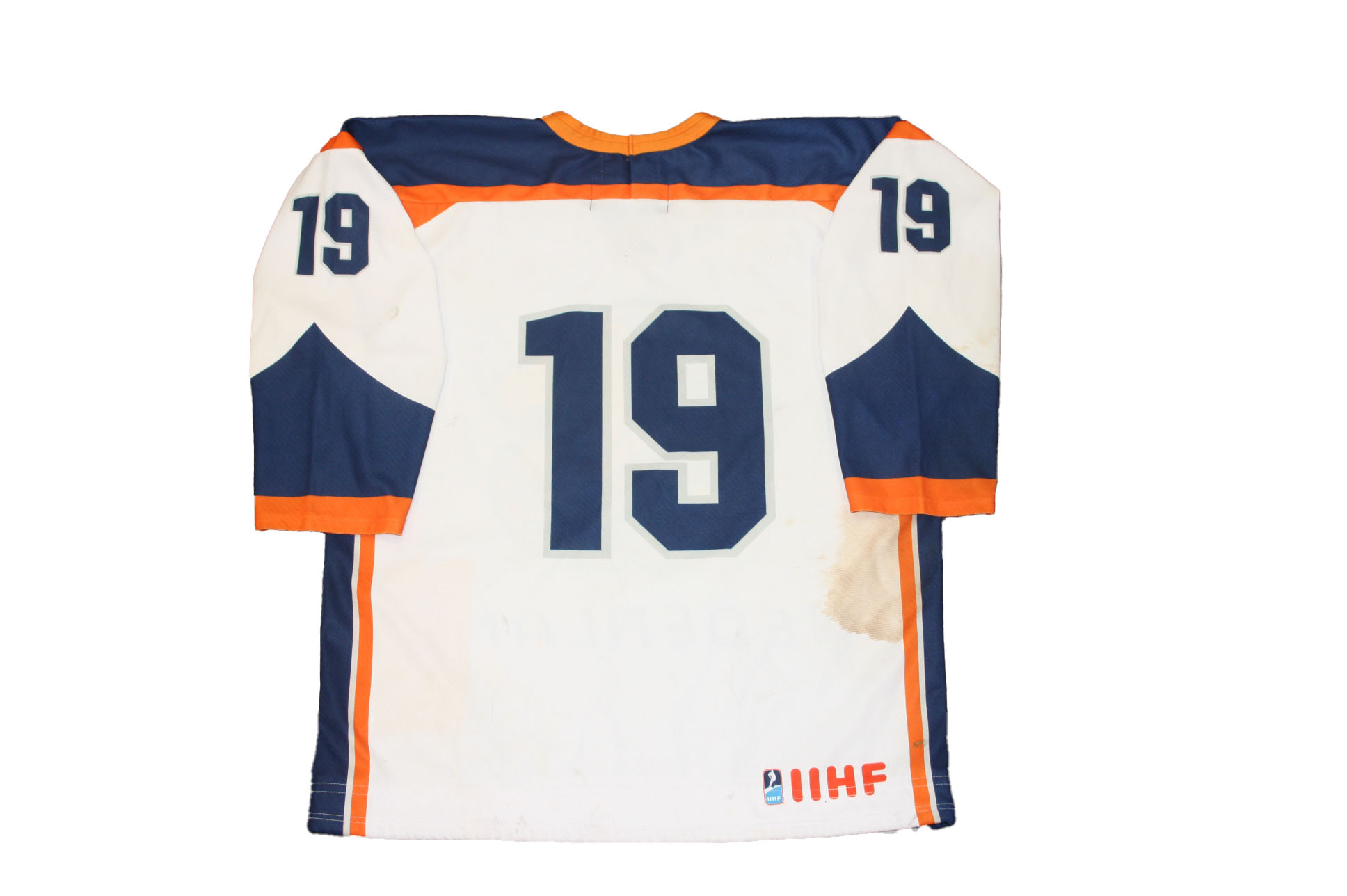 Het ijshockey shirt heeft gebruikers sporen. Voorop en achterop zitten bloed vlekken. En voorop een gerepareerd gat.
